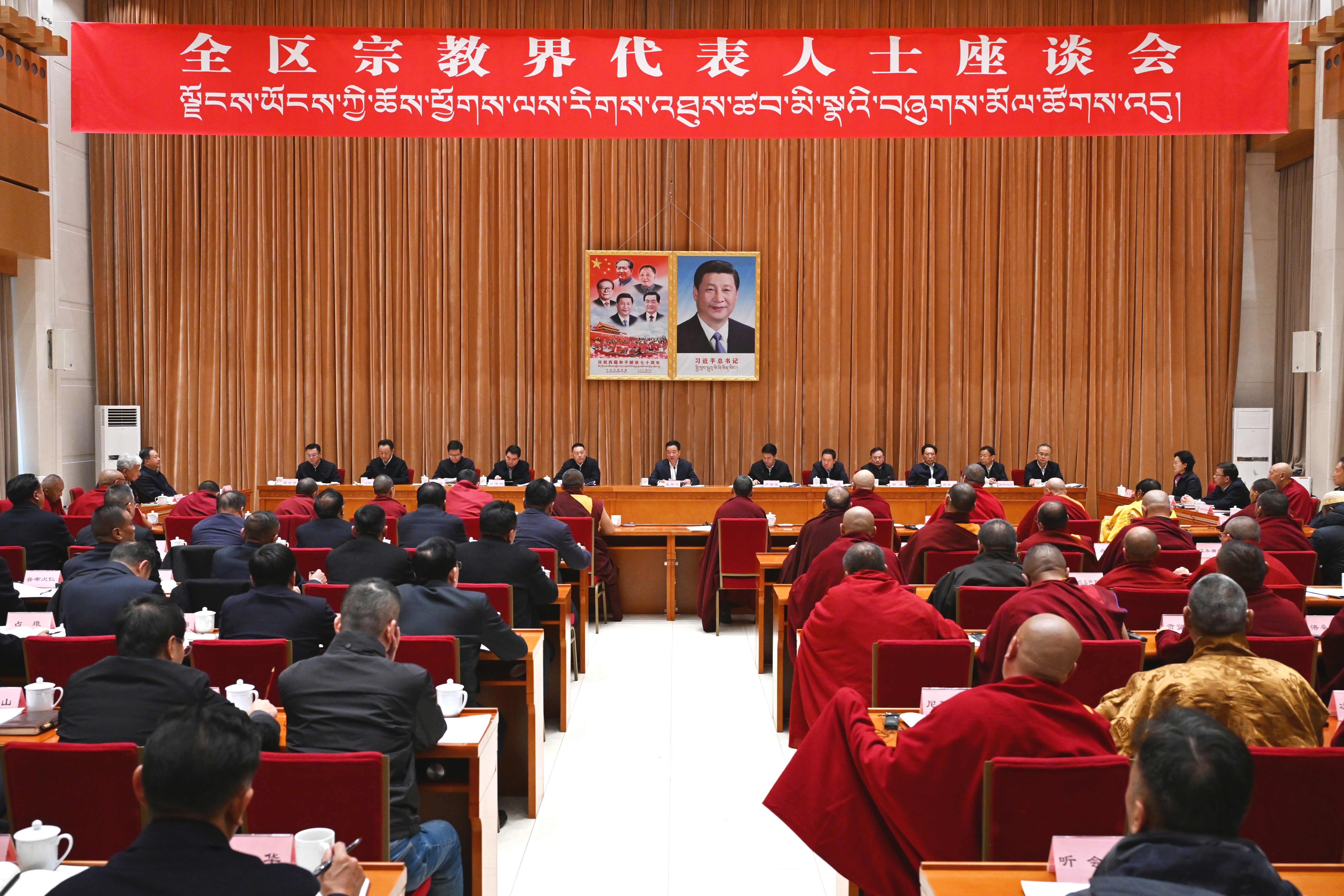 2025年11月11日,自治区宗教立法座谈会在西藏人民会堂106会议室召开,自治区党委书记王君正听取有关立法工作起草情况,并与宗教界代表人士亲切交流。
