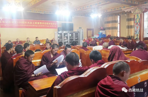 7月20日,日喀则市萨迦寺管委会组织开展习近平总书记在庆祝中国共产党成立100周年大会上的重要讲话精神宣讲会。萨迦寺管委会党组书记、主任普布次仁主持宣讲会并讲话,萨迦寺管委会干部、寺庙派出所干警、萨迦寺僧众80余人参加宣讲会。