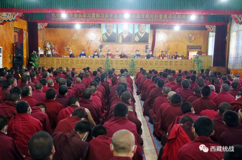 会议传达学习了习近平总书记在西藏视察时的重要讲话精神、旦科常委在全区宗教界人士学习贯彻习近平总书记在哲蚌寺视察时的重要讲话精神座谈会上的讲话精神。自治区佛协理事、扎寺管委会副主任赛巴·多布琼和自治区佛协理事、扎寺管委会委员嘎钦尼玛平措代表广大僧众在宣讲会上交流了学习体会。他们表示,习近平作为中共中央总书记、国家主席、中央军委主席到西藏庆祝西藏和平解放,这在党和国家历史上是第一次,充分表达了党中央对西藏工作的支持,对西藏干部群众的特殊关怀;习近平总书记到哲蚌寺视察,是对全区宗教工作的充分肯定,更是对广大宗教界人士的极大鼓励和鞭策,大家一定要牢记习近平总书记谆谆教诲,继承和发扬扎什伦布寺爱党、爱国、爱教的优良传统,以史为鉴带头引导广大僧众永远感党恩、听党话、跟党走,坚决划清与十四世达赖和达赖集团的界限,坚定不移维护祖国统一和民族团结。