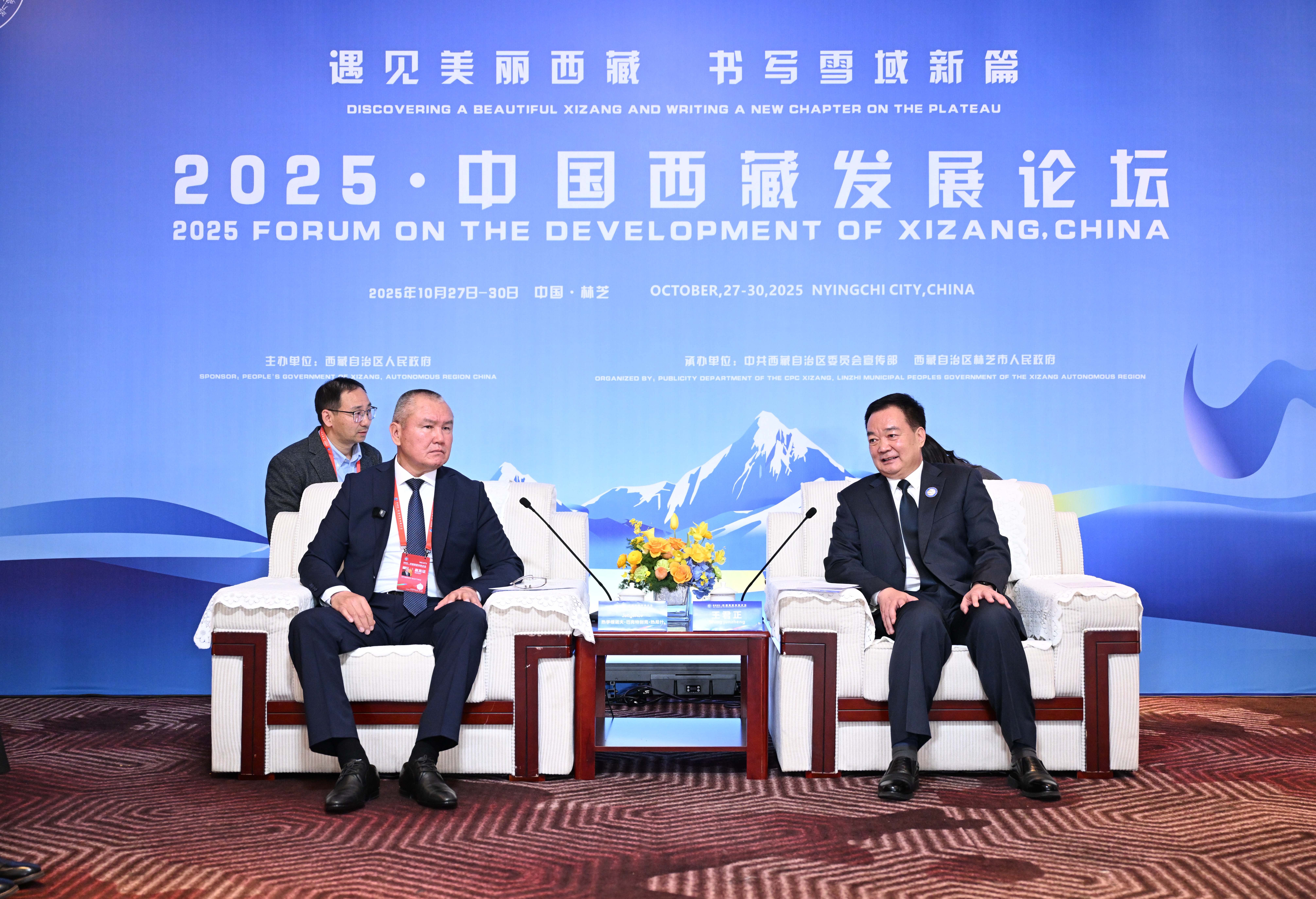 2025•中国西藏发展论坛系列活动10月27日至30日在林芝举办。28日,自治区党委书记王君正在林芝会见参加本次论坛的外国政要和驻华使节。这是王君正会见吉尔吉斯共和国总统驻伊塞克湖州全权代表热季根诺夫。记者 旦增西旦 摄